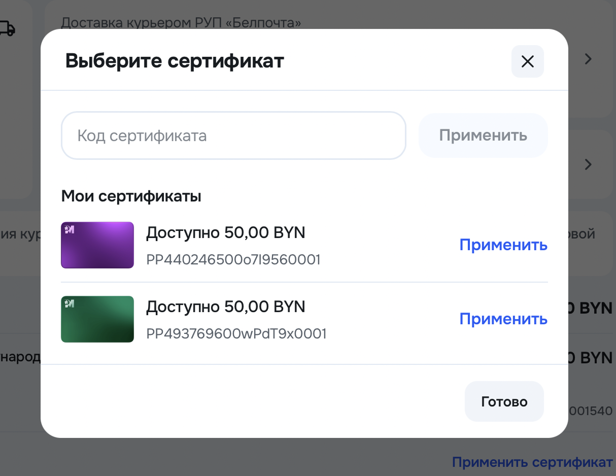 Сертификат является электронным и может быть использован для оплаты товаров на интернет-площадке postmarket.by (в ее мобильном приложении). При оформлении заказа необходимо нажать на кнопку «Применить сертификат» и ввести уникальный код сертификата.